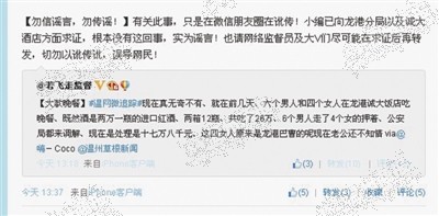 昨日下午1点37分,龙港百事通转发微博辟谣,表示他们已求证,“土豪餐”系造谣,希望网络监督员和大V们尽可能求证再转发。为了解造谣者的目的,记者联系了用龙港网民监督团申请微博的加V网友@若飞走监督,但当事人并没有回应。他微博中的@嗨-Coco则查无此用户。昨日下午5时许,记者再次登录微博以及本地某论坛网站,相关内容均已被删除。