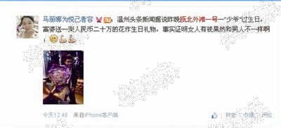近日,在微博、微信里,一年轻小伙手捧一束由不同面值人民币叠成的“花”的图片被网民迅速传播。该图的配图文字提到,该小伙是瓯北一家KTV会所的一名“少爷”,这束“花”是一富婆送的,用了20万人民币。