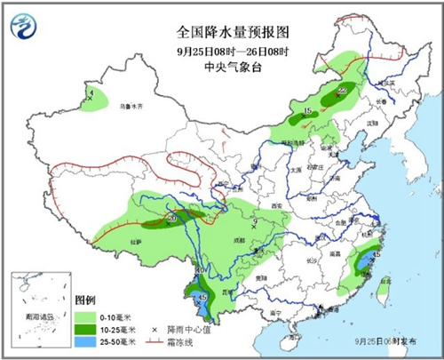 25日8时至26日8时,新疆伊犁河谷、内蒙古中东部、华北北部、西藏中东部、青海南部、西南地区大部、江南东部等地有小到中雨,其中,云南西部、浙江南部、福建北部等地的部分地区有大雨(25~45毫米)。