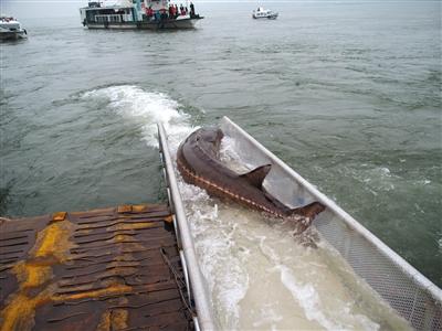 科研人员放流捕捞的野生中华鲟。资料图片