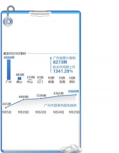 广东省卫生计生委9月25日通报全省登革热疫情,截至当日零时,共有18个地级以上市报告临床诊断和实验室确诊病例8273例,累计病例数较去年同期上升1341.29%。其中本地病例8241例,境外感染输入病例32例。累计报告死亡病例3例,其中广州2例、佛山1例。