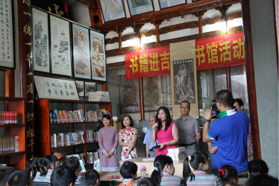 吉夫图书馆是永兴沙园村意大利归侨马振忠6年前创办的,有藏书2万余册,隔壁利民民工子弟学校的学生和附近村民都是这里的忠实读者,是村里的社区文化大礼堂。此次活动,民进总支在图书馆设立两个“民进书架子”,送来历史名著、优秀诗歌散文、儿童经典读物等优秀阅读作品1500余册。修谦学堂黄老师为民工子弟带来了百余本《论语》,与孩子们一起诵读《论语学而》、《弟子规》等国学经典,100来位学生、家长、民进会员参加了经典诵读。