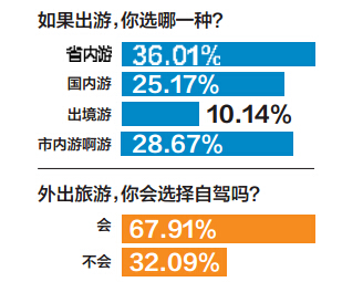 短途、自驾,是假期不少人的偏爱。从温都微调查的数据来看,在这个“十一”长假,很多人都选择了短途出行,出游目的地“省内游”占36.01%、“市内游”占28.67%。在出行选择上,“自驾”占67.91%。