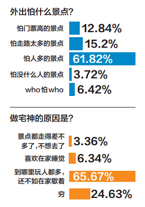 微调查中“外出怕什么景点”,有61.82%选了“怕人多的景点”。另外,“国庆宅在家的原因”里有65.67%归为“到哪里玩人都多,还不如在家歇着”。这样看来,数人头的景点真是有点不得“人心”了。