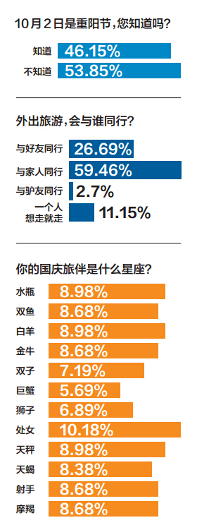 细心的市民可能会注意到,今年的重阳节刚好和国庆节挨着,2日就是“九九重阳”。在问卷调查中发现,知道的人占了46.15%,不知道的占了53.85%。不过从调查来看,外出旅游“与家人同行”的比例高达58.46%。