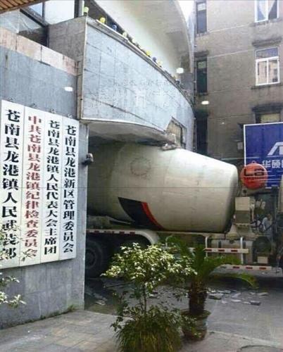 昨天,一辆水泥搅拌车卡在龙港镇政府大门口,拱门上的大理石被刮落了一块。龙港镇宣传办主任李敏说,事故系院内施工车辆操作不慎所致。