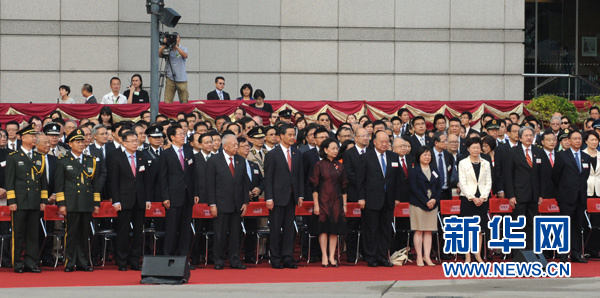 全国政协副主席董建华、香港特区行政长官梁振英、中央政府驻港联络办公室主任张晓明、外交部驻港特派员公署特派员宋哲、解放军驻港部队司令员谭本宏少将、政委岳世鑫中将,以及香港社会各界人士和市民共同见证了这一庄严时刻。