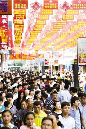 相比之下,高端商业百货则相对冷清。虽然商家推出了诸如满就送、打折以及免单等优惠措施,但是前来购物的市民仍是屈指可数。“虽然国庆节推出了一些优惠措施,但是大部分昂贵的服装还是买不下手,部分优惠措施甚至只是赠送一两百元的专柜代金券,给人一种进一步‘绑架消费’的感觉。”一位在时代广场二楼试穿品牌女装的蔡女士对记者说道。(记者吕天然)