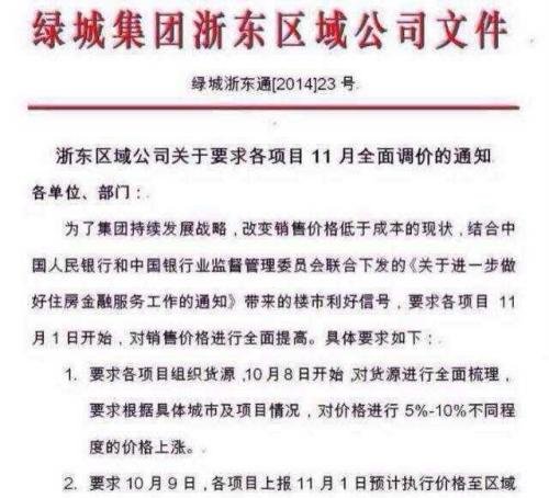 10月1日晚间,网上流传出一份疑为绿城集团浙东区域公司发布的《浙东区域公司关于要求各项目11月全面调价的通知》,文件显示,绿城集团要求趁着央行和银监会周二放松限贷的楼市利好,下月起全面提高销售价格,10月8日起全面梳理货源,对价格进行5%-10%的价格上涨。