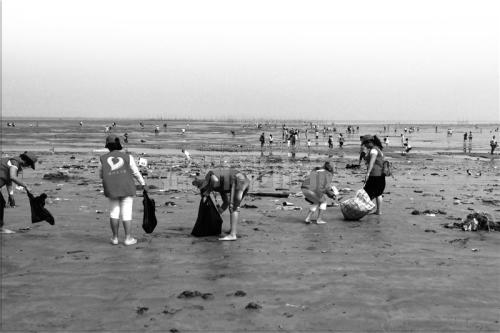 西湾管理处的工作人员说,十一长假期间,西湾沙滩共接待游客达8万多人次。由于游客每天都扔下大量的垃圾在沙滩上,他们不得不请保洁公司来清理,“每天早上保洁员用箩筐挑走几百担垃圾。”