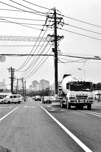 交叉口附近一工地保安说,经过这个路段的车辆速度普遍较快,尤其是晚上,电线杆立在中间实在太危险了。另外,他还说7月份时有辆大货车经过电线杆附近,刮到挂下来的电缆,出了事故,幸好人没事。记者抬头一看,空中电缆盘根纠错,被刮到的电缆已被捆紧,并打上“限高3.5m”警示牌。而该路段不仅只有这一根电线杆,沿途路边另有五根,依次沿道路东侧排列开,两两相隔约几十米。