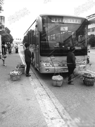 昨天上午8点54分,一位网友在微博里发图说道,她去坐公交车时,看到这样的一幕:一个小贩在拍一辆75路公交车的车门,另一个小贩在拦车,可公交司机却不开门,地上放着四箩筐水果。