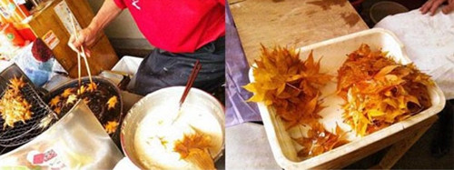 由于枫叶本身没有味道,必须先经盐渍一年之久,再裹上甜面粉,油炸成“红叶天妇罗”,许多美食家在网络上都曾经分享过这款创意点心。