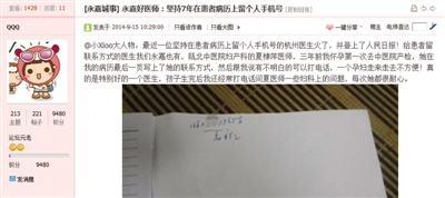 近日,网友“小xioo大人物”不但在网上留言,还有图有真相,晒出了夏医生在她病历上留下的电话号码,“永嘉好医生”一下子走红。日前,笔者走近夏棣萍医生,了解这位好医生为什么这么贴心。
