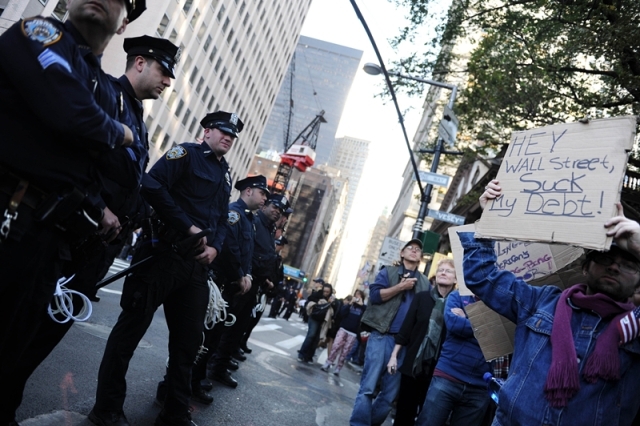 10月14日,在华尔街游行的示威者再次与警方冲突。示威者挥舞扫把、铲子等清扫工具,一路高喊“清扫华尔街”的口号。警察骑摩托车跟随,在路边架起铁栅栏防止突发事件。行进过程中,多名示威者向警察扔掷矿泉水瓶和袋装垃圾,与警察正面冲突,警方随即逮捕大量示威者。
