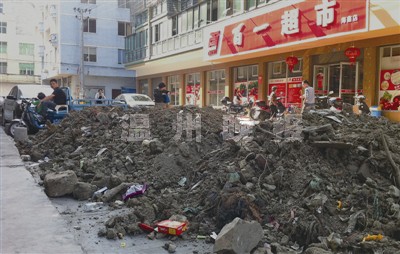 昨天下午,记者来到苍南龙港缪先生所说的这条马路。它位于海城菜场边,长约400米,有两条双向车道。道路两侧是居民房,开着超市、家电、服装等几十家店。据了解,这条马路平时人流量较大,目前还没有命名。可是,如今在道路南侧20多间店面的门前,堆放着一排泥土和砂石以及一些生活垃圾,约半个人高,占据了一条车道。
