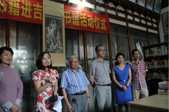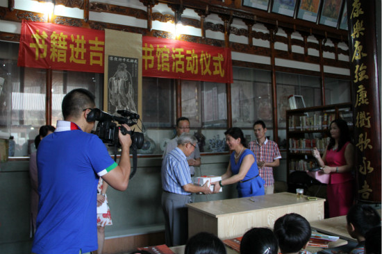吉夫图书馆是永兴沙园村意大利归侨马振忠6年前创办的,有藏书2万余册,隔壁利民民工子弟学校的学生和附近村民都是这里的忠实读者,是村里的社区文化大礼堂。此次活动,民进总支在图书馆设立两个“民进书架子”,送来历史名著、优秀诗歌散文、儿童经典读物等优秀阅读作品1500余册。修谦学堂黄老师为民工子弟带来了百余本《论语》,与孩子们一起诵读《论语学而》、《弟子规》等国学经典,100来位学生、家长、民进会员参加了经典诵读。