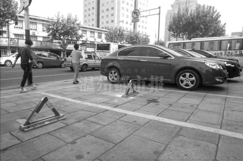 昨天上午10时许,记者在黎明西路259号前的人行道上看到,此处共有9个公共停车位,每个停车位上都安装了地锁,有8个停车位上停放着车辆,唯一一个空闲的停车位上了锁,路过的一辆私家车只好临时停在了上锁车位旁边。记者发现,这些地锁还是崭新的,螺丝安装处的地面上还有刚被钻过的痕迹。