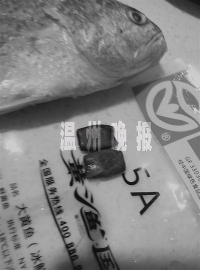 10月17日晚上,周女士从冰箱里拿出“黄渔国”买来的一条黄鱼,打算做汤给住院的婆婆补身体。她打开包装袋,刮了鱼鳞后,将鱼对半切开。周女士说,她是将鱼放在水槽里切的,刚切开鱼肚子时,就听到“咯噔”两声,发出有东西掉落的声音。她觉得很奇怪,就往水槽里一看,居然发现了两块黑色物体。她说,这两块黑色物是小长方形,形状规则,大小相差不大,长约2厘米,宽约1.4厘米,厚约0.6厘米,共一两重左右。