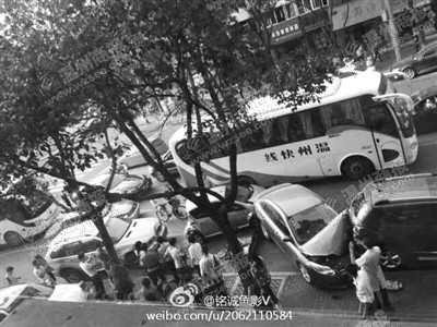 根据目睹事故全过程的小张描述,当时宝马车在拐弯时,刮到正在过马路的行人。这时宝马车突然“疯了”一样撞向停在路旁的一辆奇瑞汽车,而奇瑞车在受到巨大撞击力后,又惯性地撞至前面的福特车,结果,福特又撞到前面的尼桑,尼桑再撞向停在最前面的一辆广本车。