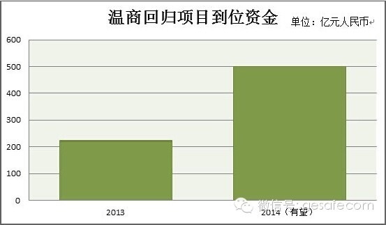 政府号召世界温商回归家乡,反哺家乡,一拨拨温商正在回来。2013年,新引进温商回归新项目392个,到位资金220亿元。今年上半年,省外温商回归到位资金214亿元,同比增长22.7%,全年有望达到500亿元。