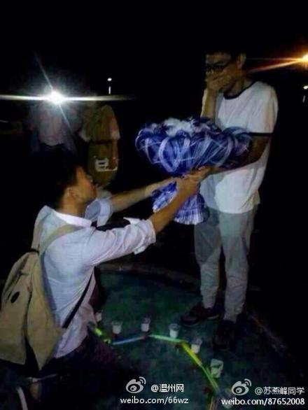 昨天,网上盛传一组照片:在温职院门口有一名男生手捧鲜花跪地向另一名男生求爱(如右图)。求爱成功后,两人还相互拥抱在一起,让人大跌眼镜。老师伯经多方打听找到了这两人,发现原来“求爱”另有隐情。