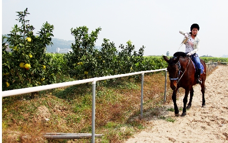 据了解,两年前,这里还只是一片单一的柚子林。在位于陶山的柚子园马术俱乐部,记者看到,这里不仅有一块近100亩的柚子林,林外还环绕着长约308米,宽约7米的椭圆形跑马场,不少游客在此先采摘柚子,再骑马,玩得兴致盎然。