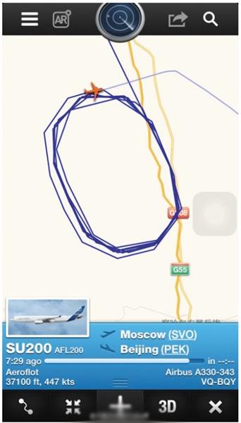网友发布俄罗斯航空公司SU200航班轨迹图,称其选择在内蒙古上空盘旋约1个半小时,等待冷空气吹散雾霾才降落北京,晚点1小时10分钟。微博截图