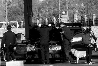 右图:民警携带警犬对通向怀柔雁栖湖地区的沿途车辆逐一排查。