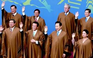 2008年,秘鲁利马,与会领导人身穿秘鲁传统民族服装“彭丘”(poncho,西班牙语,音译,意为“披风、斗篷”),举行大合影。