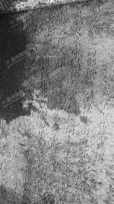 “一般古时刻碑,不会随随便便刻好,这个吴鼎应该是书法功底比较好的,采用了他的书法,叶式则是石碑内容的撰写者。”潘先俊说,根据石碑上的文字判断,赤沙的石碑与泰顺古代志书《分疆录》上提及的一块名为《新建城垣记》的石碑属于同一块石碑。石碑记录了当时温州知府丁瓒到泰顺时,听闻县城没有城墙经常遭受虎患及寇乱,天一黑,百姓就把大门关起来,不敢出来。丁瓒感叹,一座城怎么可以没有城墙,于是上报兵备道、巡抚等人,筹资兴建泰顺城墙,当时共有1980名民夫参与了修建泰顺城墙。