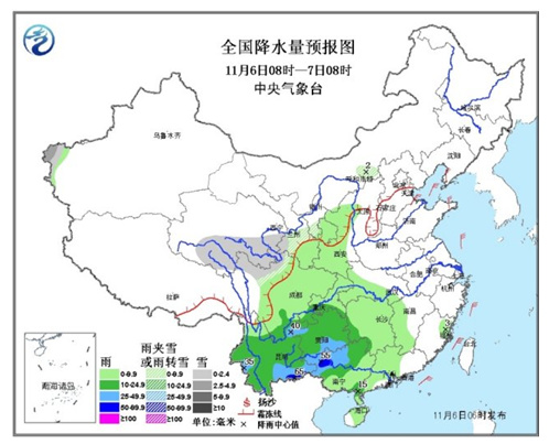 6日08时至7日08时,新疆西南部、青海东部、川西高原北部等地的部分地区有小到中雪或雨夹雪;西南地区大部、江汉西部、江南中西部、华南大部等地有小到中雨,其中,云南南部和东北部、广西北部、贵州南部等地的部分地区有大雨,局部地区有暴雨(50~65毫米)。内蒙古东部、东北地区中南部、华北南部、黄淮北部等地有4~6级风。渤海、黄海中北部有6~7级、阵风8级的东北风。