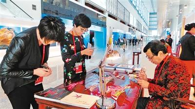 两位参会代表观赏国家会议中心大厅展示的哈氏风筝工艺。