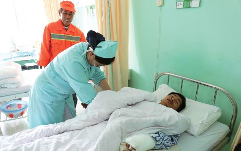 手术后,躺在病床上的“娃子”看看自己打着石膏的左手,又抬头看看老孙,两人都笑了……