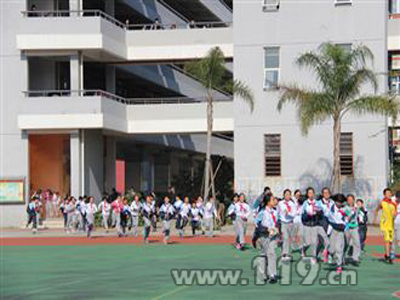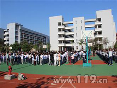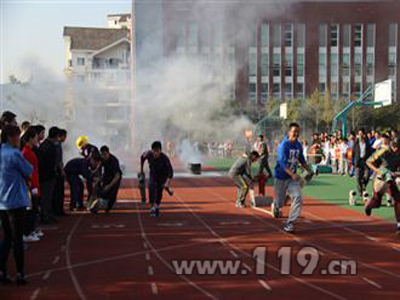突然间,做为比赛场地的滨海学校的警铃大响,教导主任通过广播通知:教学楼一楼因电线老化“起火”了,请全体师生立即疏散至操场。各班学生在任课老师的带领下开始有序疏散,历经3分16秒,全校2151名学生及教职工全部疏散到了安全地带。而完全不知“火情”的全体参赛队伍现场“目睹”了这一幕令人震撼的“火场大逃生”,现场接受了火灾逃生教育。