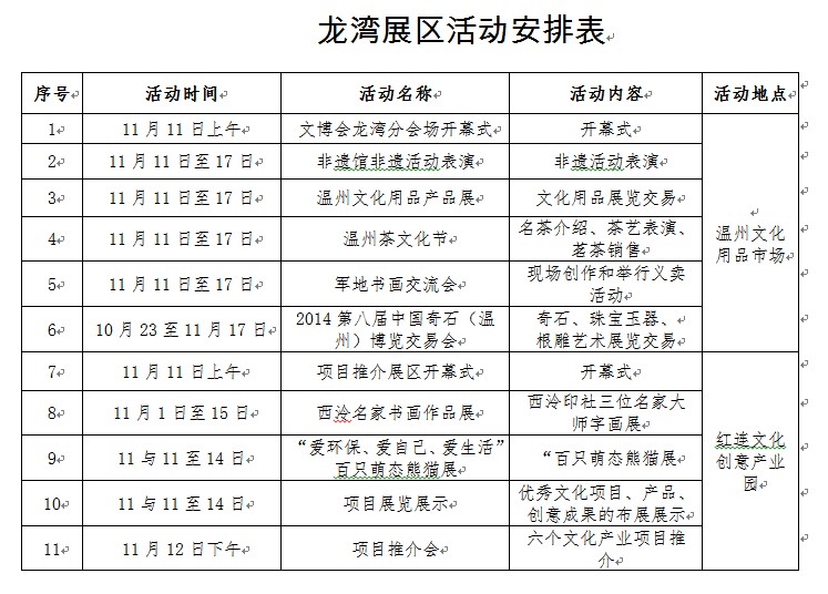 根据安排,在为期一周的时间里,文博会龙湾分会场将好戏连连,精彩不断(具体活动安排请看下表)。市民在逛文博会时,可以大饱眼福。据了解,龙湾分会场安排设置了两大展区,分别为文化用品展区(设在温州市文化用品市场,文昌路166号)和项目推介展区(设在温州红连文化创意园,文昌路209号)。其中,文化用品展区主题为“文化用品·温州制造”,主要依托温州文化商品市场,展示文化商品制造类企业产品,通过非遗馆百工百技表演、奇石温州博览交易会、文化产品展销会、茶文化节等系列活动进一步集聚文化用品市场的人气,进一步扩大温州文化用品行业的知名度;项目推介展区主题为“聚力时尚文化·助推产业发展”,面向全市征集文化产业项目,形成优秀文化产业项目库,开设项目推介专区,集中邀请各地投资商前来投资洽谈,为不同文化创意产业企业、单位提供招商引资推介平台。