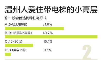 温州万豪房产营销策划有限公司总经理潘明荣说,这个数据跟平时接待的客户的需求基本一致。“这是因为多层和小高层相比高层住宅,分摊面积小,价格也要低。”而高层住宅中,楼层越高价格越高,比如20层和28层,都可以看到江,面积也相同,但若买28层,就要多付50万元,出于经济考虑,大部分人会选择楼层低一点的房子。而30层以上的房子多以大厦为主,这类房子基本没有小区的配套,价格也高,选择的人少也不足为奇了。