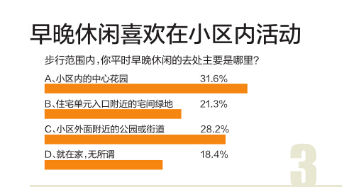 结论:温州居民步行范围内平时早晚休闲的去处,主要是小区内的中心花园,即使在城市公园周边的小区,小区内的中心花园仍然是平时早晚休闲的首要选择地。这说明只要有条件,大家日常生活还是愿意在小区内部中心公园活动的。