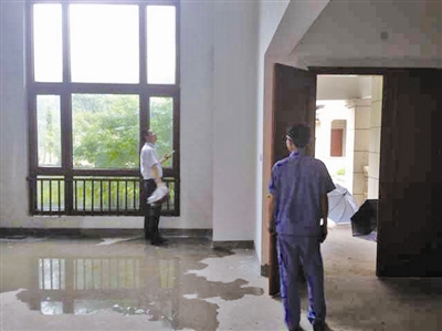 最严重的一次漏水,发生在今年8月份,那天雨下得很大。张先生说,他从市区赶过去一看,一楼大厅靠近窗边的墙壁上正有股水向下渗流,无法排出,使得地上也积起了大摊水迹,面积有10多平方米。他一脚踩下去,深的地方连鞋面都没过了,足有两三厘米深。