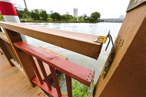 时隔一个月,昨天记者再次前往三板桥查看,发现步道护栏有被修理过的痕迹。破损护栏被几根木条连了起来,颜色明显不同,但修过的护栏仍然被严重损坏。船只经过,断裂木条之间的距离一下子从几厘米拉长到几十厘米。