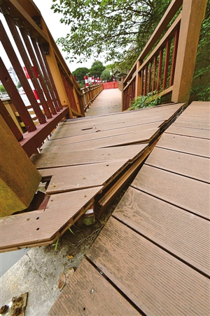 鹿城城管与执法局市政处道桥管理科负责人:滨水公园确已移交我们管理,但步道却不在这范围内,也不包含浮桥。但步道没人养护也不行,所以我们也去修过。虽然人为破坏较明显,但该浮桥用料是定制塑木,船只经过时,步道上下浮动,接头处也较容易自然脱节,而我们找不到相同的用料,虽然换上去的都是实木,也很快就被损坏了。