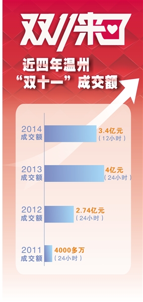 随着“剁手族”大军的壮大,近四年温州“双十一”当天的成交额呈现几何级的增长。2011年成交额才4000多万,2012年成交额为2.74亿元,2013年成交额为4亿元。