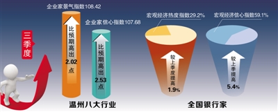 近日出炉的温州企业景气调查报告显示,今年三季度,全市八大行业的企业家景气指数和信心指数分别为108.42和107.68,比预期的指数分别高出2.02点和2.53点,这表明我市经济发展态势总体良好,企业家对未来宏观经济环境持续保持乐观。而就全国宏观层面,银行家宏观经济热度指数也在有所回升。
