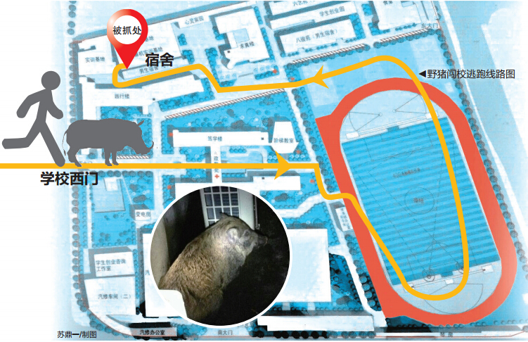 回忆起当时追赶野猪的情景,该校唐姓保安说:“别看这头野猪块头不是很大,但力气很大,跑到男生宿舍楼下时,把铁门拱得当当响。”