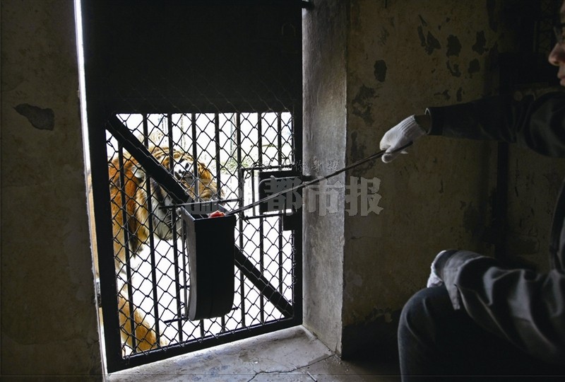 孙思聪是猛兽区年龄最小的一名饲养员,主要负责“照顾”老虎、金钱豹和熊,已经在这里工作了4年。踏进工作区域前,孙思聪反复叮嘱:“这里的老虎和马戏团的老虎可不一样,要注意与它保持距离,喂食的时候要小心自己的手。”
