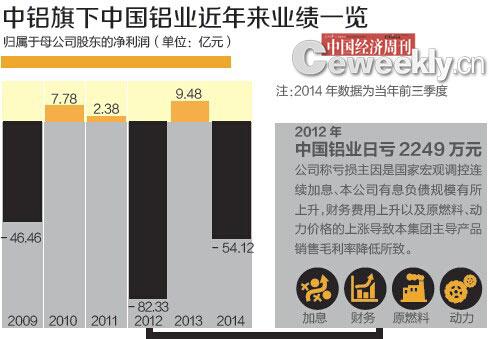 中铝公司旗下上市公司中国铝业也因连续的巨额亏损成为A股“亏损王”:在熊维平接手的2009年第一次巨亏46.46亿元;2012年再次亏损高达82.33亿元; 2013年,为避“ST”(A股市场退市风险警示),中国铝业三度甩卖资产,实现当年扭亏。然而,到了2014年上半年,公司巨亏超过40亿元,再度成为A股半年报的“亏损王”。