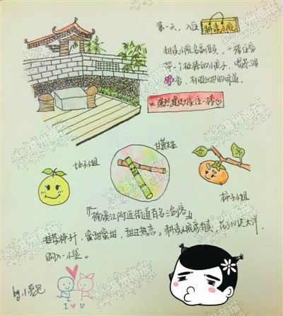 帖子里,手绘游记的彩色插图笔调虽不专业,却十分清新可人。插画边上的旁白有景点攻略,亦有个人感触,还不忘加点题外话戏谑一番,称柚子、甘蔗、柿子为楠溪江有名的“三剑客”,又将民宿主人养的狗也加入插画。