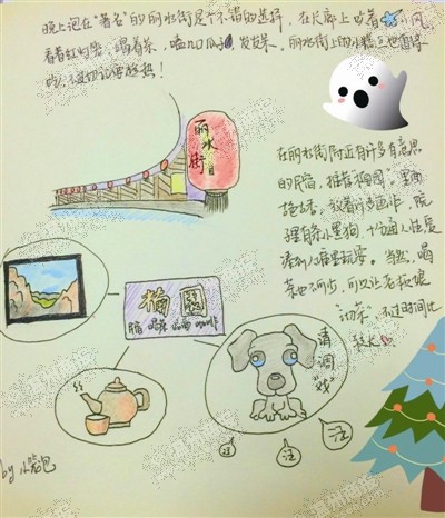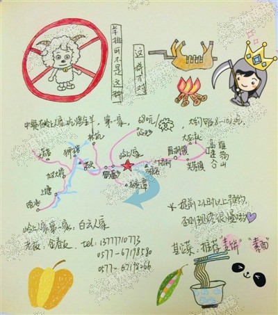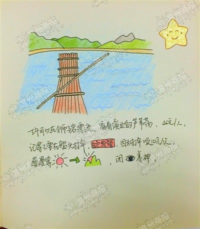 丽水街、石栀岩、烤全羊……这些可是永嘉楠溪江响当当的代言词,近日,一篇游客的手绘楠溪江游记,却让这些独特的标志物跃上画纸,一时间引来不少官方微博、官方微信转发。更有网友在论坛上贴出该游记,表示“这么萌的手绘楠溪江游记,不转不行”。永嘉官方微信平台转载了此帖后,三天时间点击率就近两千。昨日,记者了解到,这份最萌手绘楠溪江游记出自杭州一萌妹子之手。