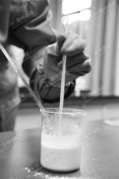 陈长胜介绍说,常见的干燥剂分两种,一是石灰干燥剂,另一种是硅胶干燥剂。相比较而言,石灰干燥剂价格低廉得多。“石灰的主要成分是氧化钙,遇水产生化学反应会生成氢氧化钙,并释放出大量的热量。如果这种反应是在一个封闭的空间内进行,就有爆炸的可能性。”随后,陈老师与商报君一起做了一个实验。