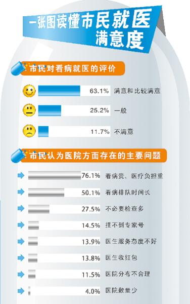 调查中,对“看病贵”颇有微词的市民不在少数。统计数据显示,对于“看病就医”的总体评价,受访者表示“满意”和“比较满意”的占到63.1%,有76.1%市民反映看病贵。